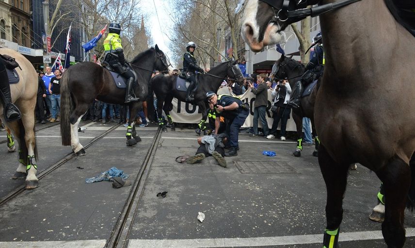 Melbourne kent merkezinde sabah erken saatlerden itibaren yoğun güvenlik önlemleri alan polis, iki grubun karşı karşıya gelmesini önlemekte zorlandı. Atlı polislerin de görev aldığı gösteride emniyet güçleri biber gazıyla müdahale etti ve bazı göstericiler gözaltına alındı.