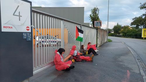 Wels'te Filistin destekçileri BRP Rotax fabrikası önünde İHA motoru tedarikini protesto etti; bazı eylemciler çatıda Filistin bayrağı ve 'Soykırımı durdurun' pankartı açtı.