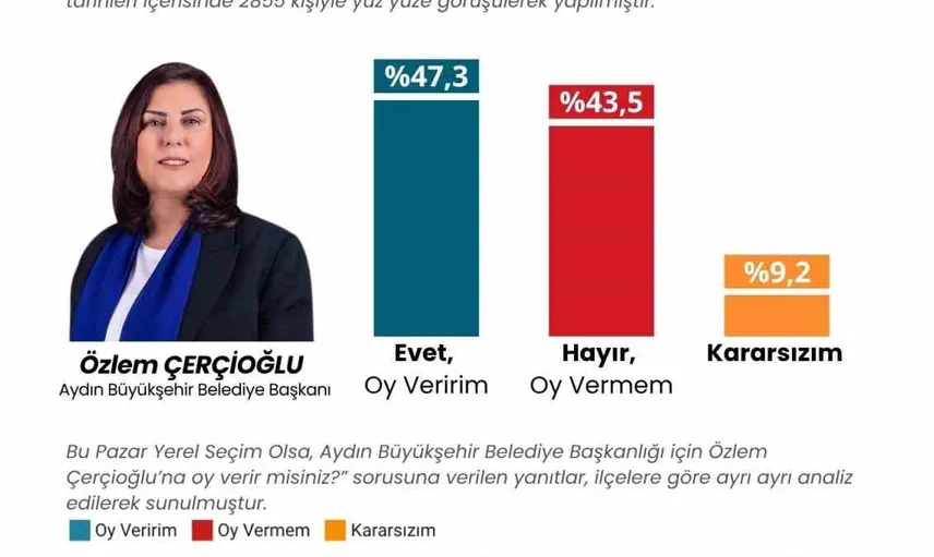 Aydın Büyükşehir Belediye Başkanı Özlem Çerçioğlu, yapılan "Seçmen Eğilimleri Araştırması"na göre Aydınlı seçmenlerin yüzde 47,3'ünden destek aldı. Araştırmada yüzde 43,5 karşı oy verirken, yüzde 9,2 kararsız olduğunu belirtti.