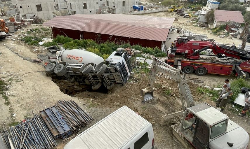 Aydın'ın Kuşadası ilçesinde, Kadınlar Denizi Mahallesi'ndeki bir inşaat alanında stabilize yol çöktü. Bu olay sonucunda, inşaata beton taşıyan 09 R 4191 plakalı beton mikseri, oluşan çukura düşerek yan yattı.