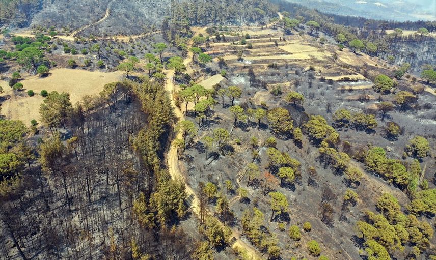 Aydın'ın Bozdoğan ilçesinde devam eden orman yangınında zarar gören yerler havadan görüntülendi.