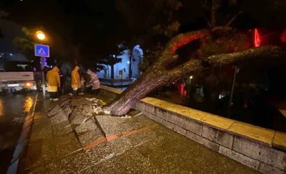 Edinilen bilgiye göre, gün boyunca etkili olan sağanak yağmur zemini yumuşattı ve kaldırımda bulunan asırlık çam ağacı kökünden sökülerek büyük bir gürültüyle devrildi.