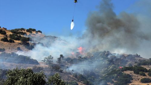 Aydın'da zeytin ağaçlarının bulunduğu alanda çıkan yangına havadan ve karadan müdahale ediliyor.