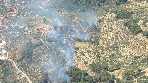 Aydın'ın Germencik ilçesinde, Dağyeni Mahallesi'nde yer alan ormanlık alanda çıkan yangına havadan ve karadan müdahale ediliyor.