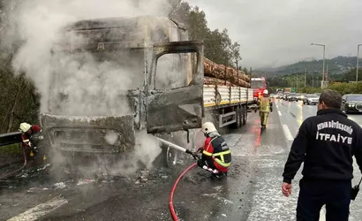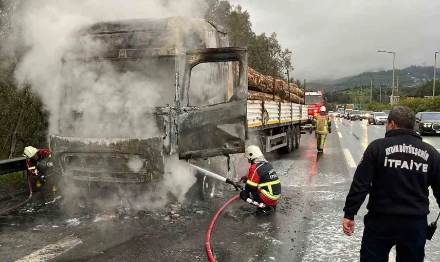 Aydın-İzmir Otoyolu Selatin Tüneli mevkiinde, K.K. idaresindeki tomruk yüklü tırda henüz belirlenemeyen bir nedenle yangın çıktı. Aracın ön bölümünde yükselen alevleri fark eden sürücü, aracı yolun sağına çekerek durumu 112 Acil Çağrı Merkezi'ne bildirdi.