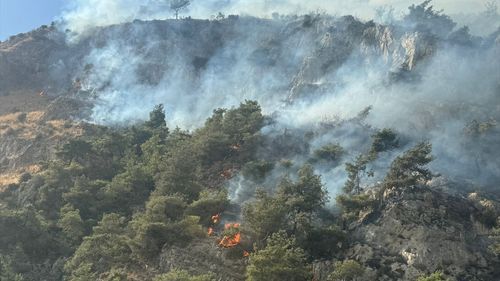 Aydın'ın Söke ilçesi Sazlı Mahallesi'ndeki orman yangınına jandarma, itfaiye ve Orman İşletme ekipleri havadan ve karadan müdahale ediyor.