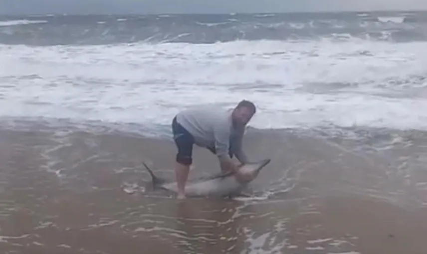 Belediye personeli Doğukan Akıncı, yunusa ulaşarak onu kucaklayıp yeniden denize gönderdi. Müdahale başarıyla sonuçlandı.