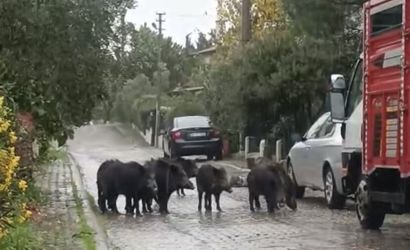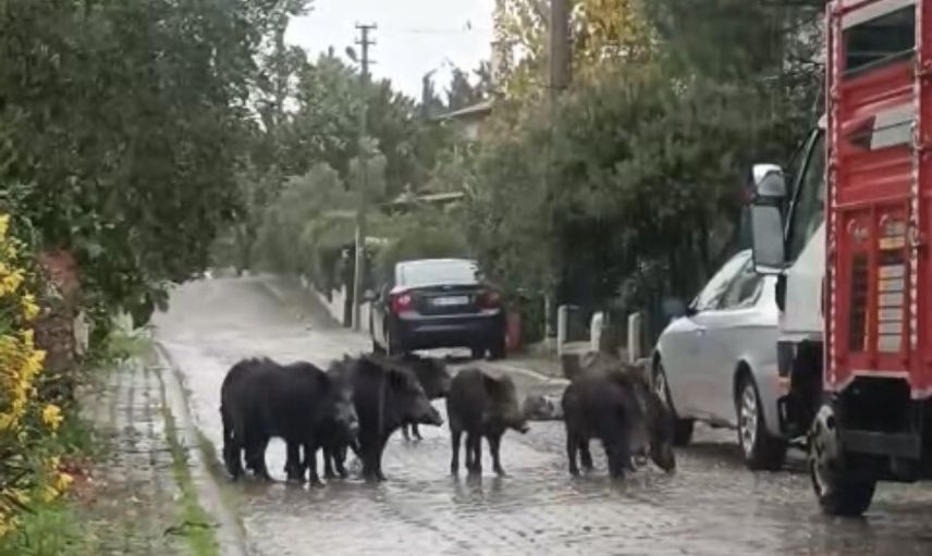 Yaban domuzlarının yiyecek arayışını, vatandaşlar cep telefonlarıyla kayda aldı; kayıtlarda hayvanların sokaklarda dolaştığı anlar yer aldı ve görüntüler sosyal medya mecralarında hızla yayıldı.