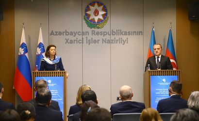 Azerbaycan Dışişleri Bakanı Ceyhun Bayramov (sağda), Azerbaycan'da temaslarda bulunan Slovenya Dışişleri ve Avrupa Bakanı Tanja Fajon'la (solda) ortak basın toplantısında konuştu.