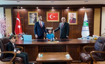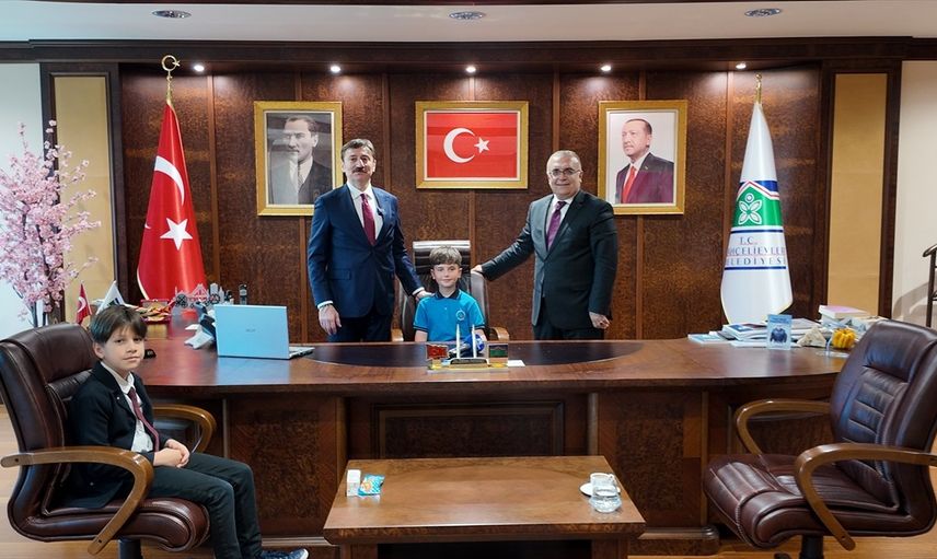 Bahçelievler Belediye Başkanı Hakan Bahadır'ın (sol 2), 23 Nisan Ulusal Egemenlik ve Çocuk Bayramı dolayısıyla koltuğunu bir öğrenciye devrettiği anda yaşanan deprem kameralar tarafından kaydedildi.