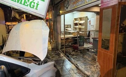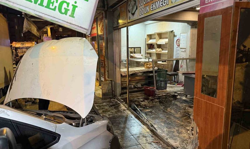 İstanbul Bahçelievler'de, kontrolden çıktığı belirtilen bir kamyonun yol üzerindeki hafif ticari araca çarpması sonucu araç fırına girerken, olay anına ilişkin görüntüler iş yerinin güvenlik kamerasına yansıdı.