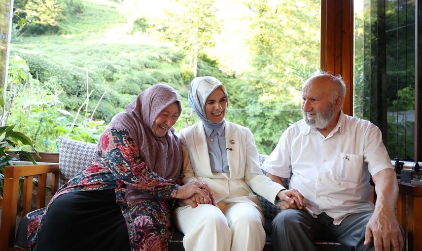 Aile ve Sosyal Hizmetler Bakanı Mahinur Özdemir Göktaş, "Aile Yılı" çalışmaları kapsamında Rize'ye yaptığı ziyarette, 63 yıldır evli olan Mükerrem (80) ve Ahmet (85) Kanbur çiftinin Pekmezli köyündeki evine misafir oldu. Ziyarette çiftin çocukları ve torunları da bulundu.