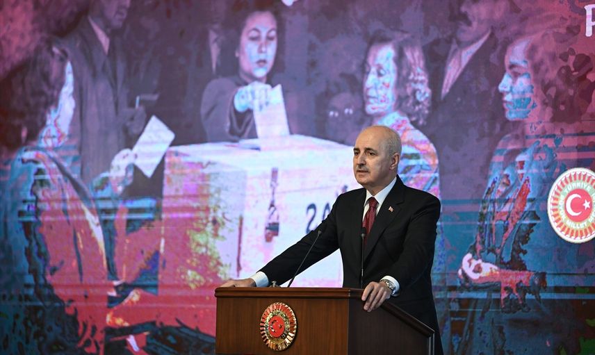 TBMM Başkanı Numan Kurtulmuş (ortada), Meclis Tören Salonu'nda düzenlenen "Türk Kadınının Seçme ve Seçilme Hakkının 90. Yıl Dönümü Programı"na katıldı. Programda Aile ve Sosyal Hizmetler Bakanı Mahinur Özdemir Göktaş (solda) da yer aldı.