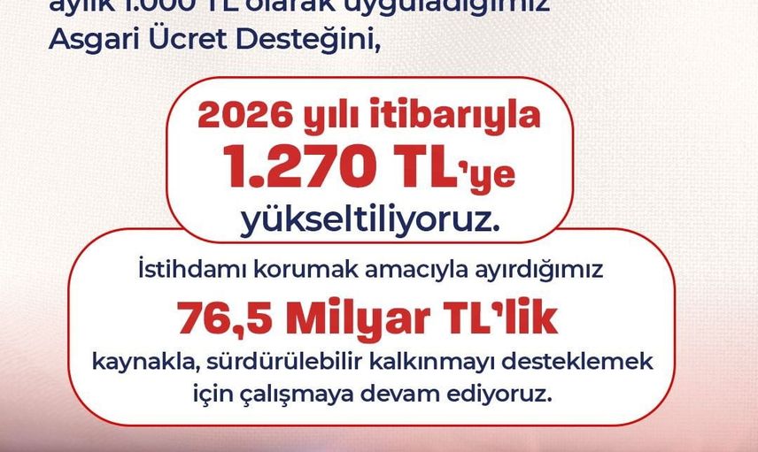 "Güçlü destek, güçlü istihdam. İstihdamı destekleyecek politikalarımızı kararlılıkla sürdürüyoruz. Asgari Ücret Desteğini, 2026 yılı itibarıyla bin 270 liraya yükseltmiştik. Önümüzdeki yıl toplam 76.5 milyar liralık kaynakla çalışma hayatımızı daha güçlü kılacak, istihdam kapasitemizi koruyacağız."
