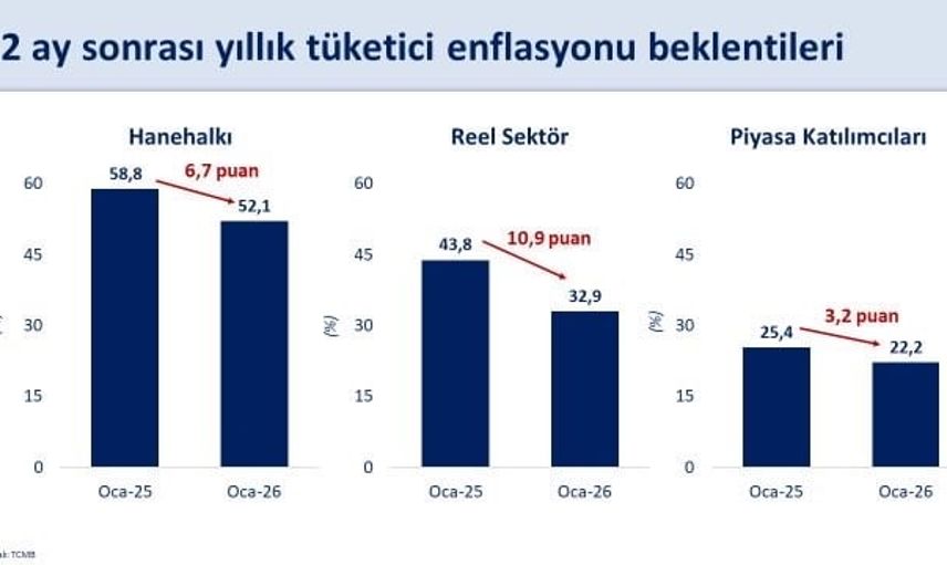 Bakan Şimşek paylaşımlarında, 12 ay sonrası enflasyon beklentilerinin geçen yılın aynı dönemine göre hanehalkında 6,7 puan, reel sektörde 10,9 puan ve piyasa katılımcılarında 3,2 puan gerilediğini belirtti.