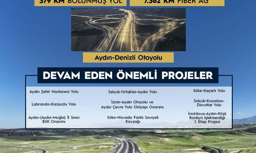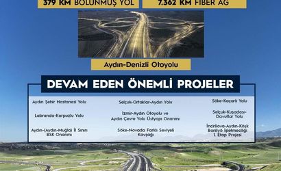 Bakan Uraloğlu’nun sosyal medya paylaşımına göre, son 24 yılda Aydın’da 379 kilometre bölünmüş yol hizmete alınırken, kent genelinde 7 bin 362 kilometrelik fiber ağ altyapısı kuruldu. Ulaşım yatırımlarının öne çıkan projelerinden biri olan Aydın-Denizli Otoyolu, bölgenin trafik yükünü azaltarak ulaşımı daha güvenli ve konforlu hale getirdi.