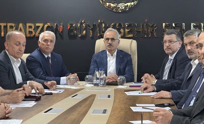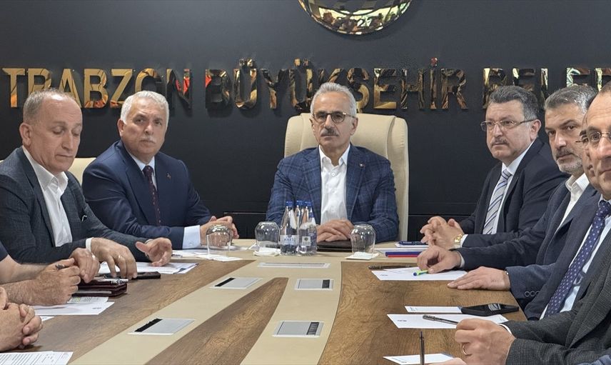Ulaştırma ve Altyapı Bakanı Abdulkadir Uraloğlu (sol 3), selden etkilenen bölgelerde incelemelerde bulunmak üzere geldiği Trabzon'da, Ulaşım Yönetim Kriz Merkezi Değerlendirme Toplantısı'na katıldı. Bakan Uraloğlu'na, Trabzon Valisi Aziz Yıldırım (sol 2) ile Trabzon Büyükşehir Belediye Başkanı Ahmet Metin Genç (sağ 3) de eşlik etti.