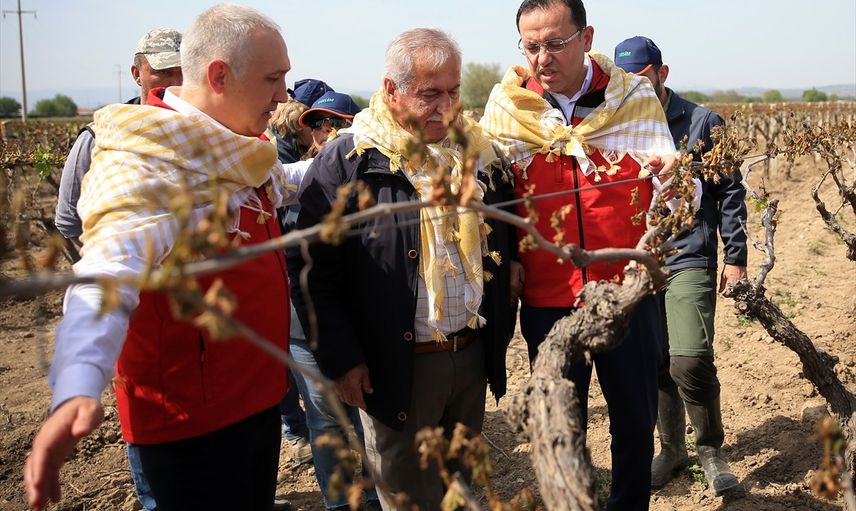 Tarım ve Orman Bakan Yardımcısı Ebubekir Gizligider (ortada), Manisa'nın Saruhanlı ilçelerinde zirai dondan etkilenen üzüm bağlarında incelemelerde bulundu. Saruhanlı'daki don zararının görüldüğü üzüm bağlarını gezen Gizligider, üreticilerden ve il tarım müdürlüğü yetkililerinden bilgi aldı, tespitleriyle ilgili gazetecilere açıklama yaptı.