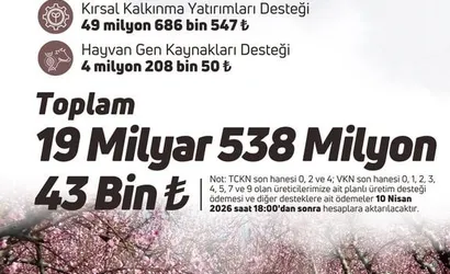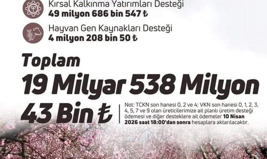 Bakanlık açıklamasına göre, T.C. kimlik numarasının son hanesi 0, 2 ve 4 olan üreticiler ile Vergi Kimlik Numarası son hanesi 0, 1, 2, 3, 4, 5, 7 ve 9 olanların planlı üretim desteği ve diğer destek ödemeleri 10 Nisan saat 18.00’den sonra hesaplara aktarılacak.