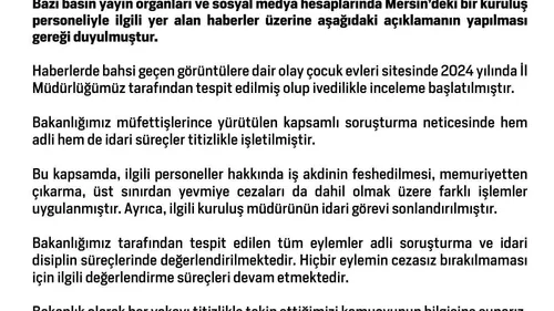 Aile ve Sosyal Hizmetler Bakanlığı'ndan açıklamaAile ve Sosyal Hizmetler Bakanlığı, Mersin'deki bir çocuk evleri sitesine ilişkin basın ve sosyal medyada yer alan haberler üzerine açıklama yaptı. Bakanlık, 2024 yılında İl Müdürlüğü tarafından tespit edilen olaya ilişkin olarak ivedilikle inceleme başlatıldığını…