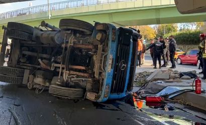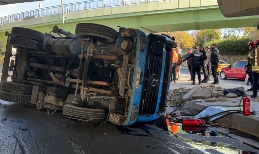Bakırköy'de yaşanan trafik kazasında, İstanbul Su ve Kanalizasyon İdaresi (İSKİ)'ne ait bir vinç, üst geçide çarparak devrildi.