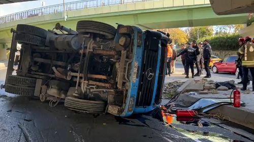 Bakırköy sahil yolunda meydana gelen kazada, İSKİ'ye ait bir vinç üst geçide çarparak devrildi.