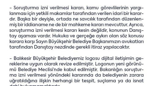 Balıkesir Büyükşehir Belediyesi, logo değişikliği sonrası İçişleri Bakanlığı'nın Başkan Ahmet Akın hakkında verdiği 'soruşturma izni'ne ilişkin açıklama yaparak kamu zararı iddialarını reddetti.