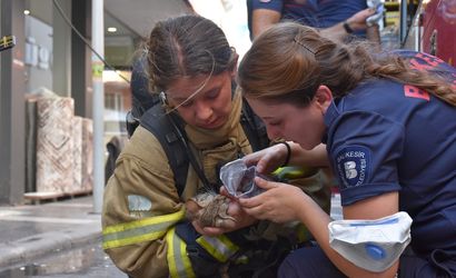 Balıkesir'de bir apartman dairesinde çıkan yangında dumandan etkilenen kedi, kadın itfaiyeci Seray Başol'un verdiği oksijenle hayata tutundu.