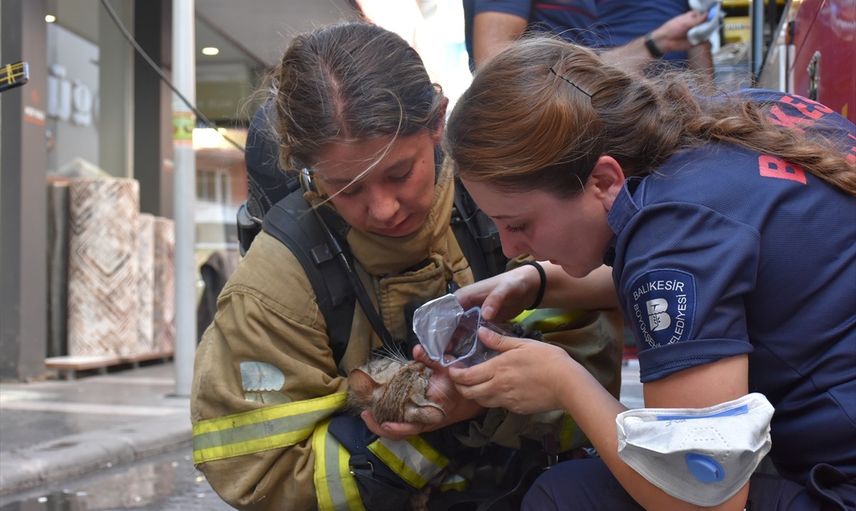Balıkesir'de bir apartman dairesinde çıkan yangında, dumandan etkilenen bir kedi, cesur bir kadın itfaiyeci sayesinde hayata döndü.
