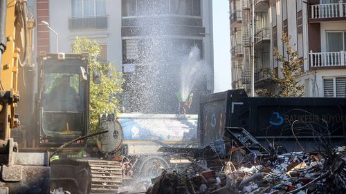 Balıkesir'in Sındırgı ilçesinde, 6,1 büyüklüğündeki depremin ardından yıkılan binanın enkaz kaldırma çalışmaları sürüyor.