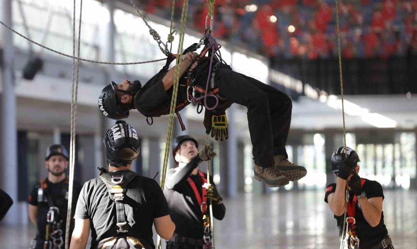 Ekipler, Merinos Yerleşkesi Fuaye Alanında gerçekleştirilen İple Kurtarma Sistemleri ve Arama-Kurtarma eğitiminde bir araya geldi. Uzman eğitmenler eşliğinde yürütülen çalışmada, tavana asılı halatlara güvenlik ekipmanlarıyla tırmanma uygulamaları yapıldı. Eğitim, yüksekten erişim, dar alanlara giriş ve dikey kurtarma gibi özel müdahale ihtiyaçlarına odaklandı ve katılımcılara hem teorik hem de pratik bilgiler aktarıldı.