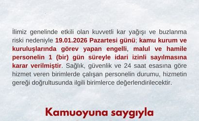 Bartın'da etkili olan yoğun kar yağışı ve buzlanma nedeniyle Bartın Valiliği yazılı açıklama yaptı. Açıklamada, 19.01.2026 Pazartesi günü kamu kurum ve kuruluşlarında görev yapan engelli, malul ve hamile personelin 1 gün süreyle idari izinli sayılmasına karar verildiği bildirildi.