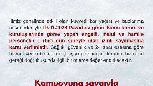 Yoğun kar ve buzlanma riski nedeniyle Bartın Valiliği, 19.01.2026 Pazartesi günü engelli, malul ve hamile kamu personelini 1 gün idari izinli saydı.