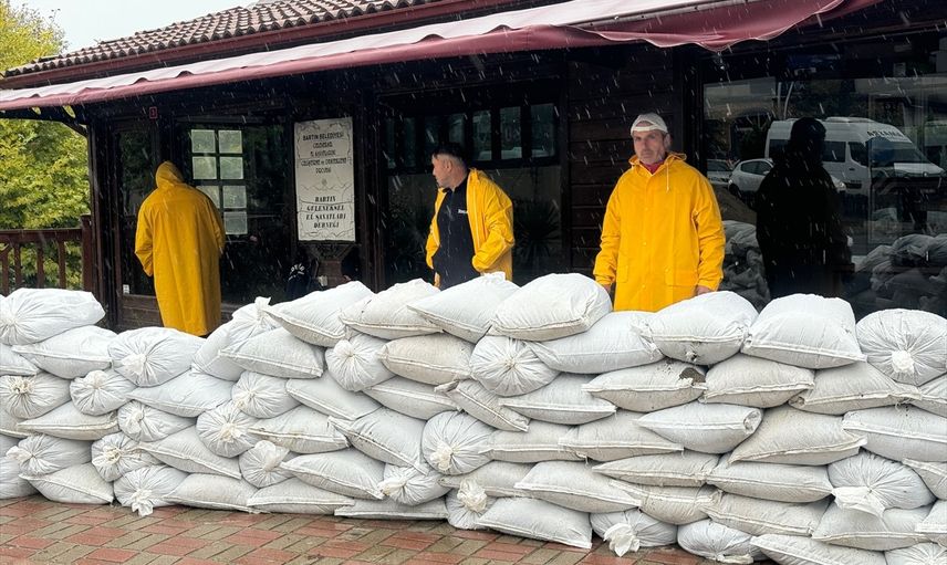 Bartın'da etkili olan kuvvetli yağış yaşamı olumsuz etkilerken, Bartın Irmağı'nın taşma riskine karşı kayalar ve kum torbalarıyla setler yapılıyor.