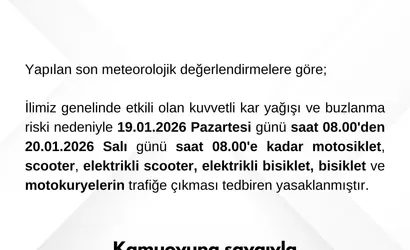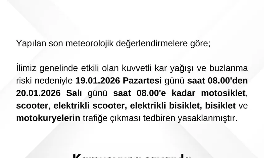 Bartın Valiliği tarafından yapılan açıklamada, "Yapılan son meteorolojik değerlendirmelere göre, ilimiz genelinde etkili olan kuvvetli kar yağışı ve buzlanma riski nedeniyle 19.01.2026 Pazartesi günü saat 08.00’den 20.01.2026 Salı günü saat 08.00’e kadar motosiklet, scooter, elektrikli scooter, elektrikli bisiklet, bisiklet ve motokuryelerin trafiğe çıkması tedbiren yasaklanmıştır. Kamuoyuna saygıyla duyurulur" ifadelerine yer verildi.
