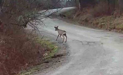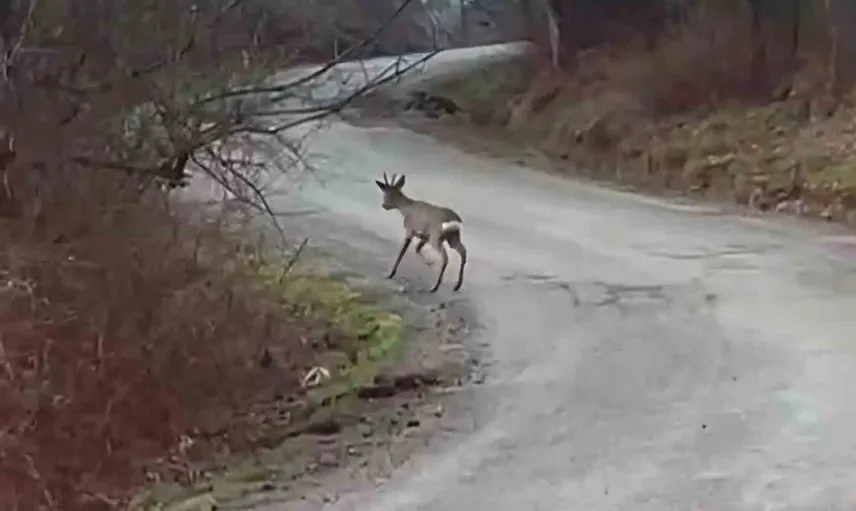 Bartın'da, Ulus ilçesi Hisar Köyü yolunda araçla seyreden bir kişi, yol üzerinde ve çevresindeki ormanlık alanda dolaşan bir karaca yavrusu görüntüledi.
