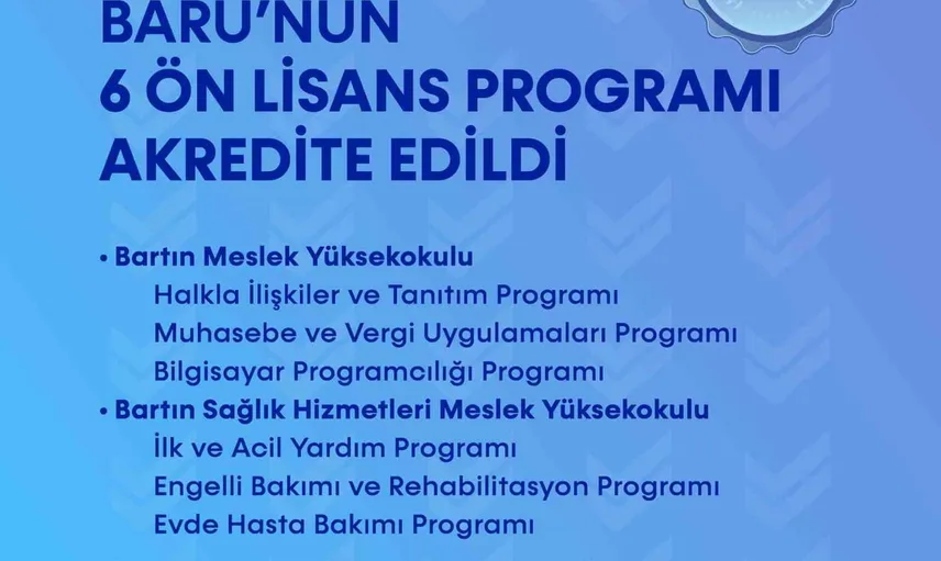 Bu kapsamda Bartın Meslek Yüksekokulu bünyesindeki Bilgisayar Programcılığı Programı, Halkla İlişkiler ve Tanıtım Programı ve Muhasebe ve Vergi Uygulamaları Programı ile Bartın Sağlık Hizmetleri Meslek Yüksekokulundaki Engelli Bakımı ve Rehabilitasyon Programı, Evde Hasta Bakımı Programı ve İlk ve Acil Yardım Programı akreditasyon belgesi aldı.