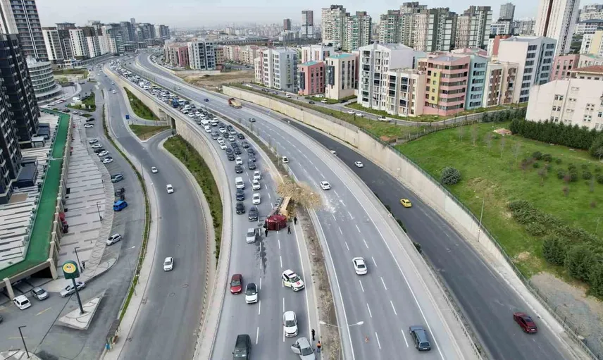 Başakşehir'de hafriyat kamyonu devrildi: Yol kısmen trafiğe kapandı