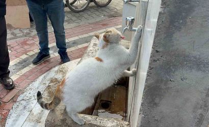 Batman'da soğuk havada susayan bir kedi, Kuyubaşı Mahallesi'ndeki otobüs durağında bulunan çeşmeye gelerek musluklardan akan suyu içti. Durumu fark eden vatandaşlar musluğu açtı ve kedi dakikalarca kana kana su içti.