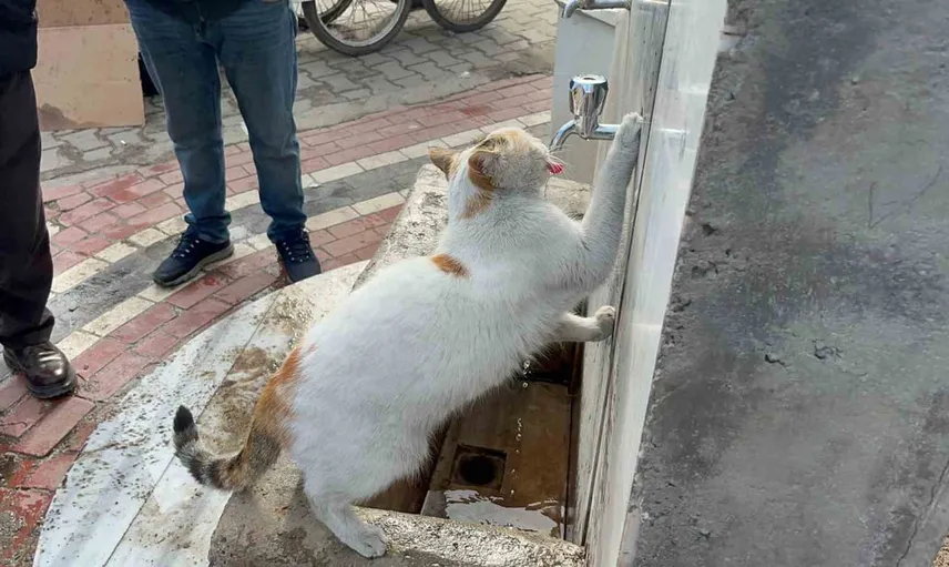 Olay, Kuyubaşı Mahallesindeki bir otobüs durağında meydana geldi. Susuzluktan bitkin düştüğü gözlenen kedi çeşmeye yaklaşarak musluklara uzandı. Duyarlı vatandaşların musluğu açmasının ardından kedi, bir patisiyle musluğu kavrayarak uzun süre su içti.