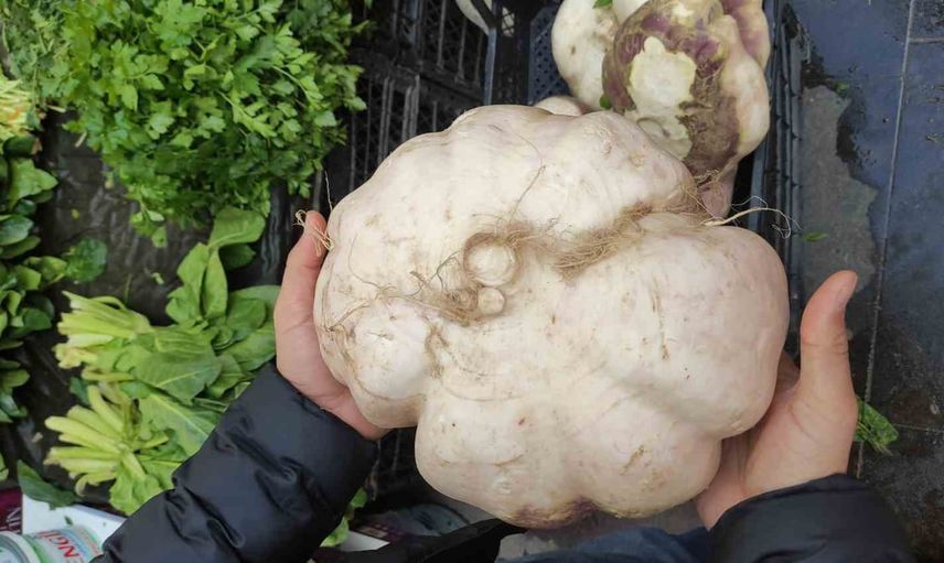 Batman'da pazar tezgahında görülen yaklaşık 4 kilogram ağırlığındaki turp, bölgedeki tipik turpların 100 ila 200 gram aralığının çok üzerinde büyüklüğüyle göze çarptı.