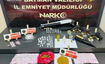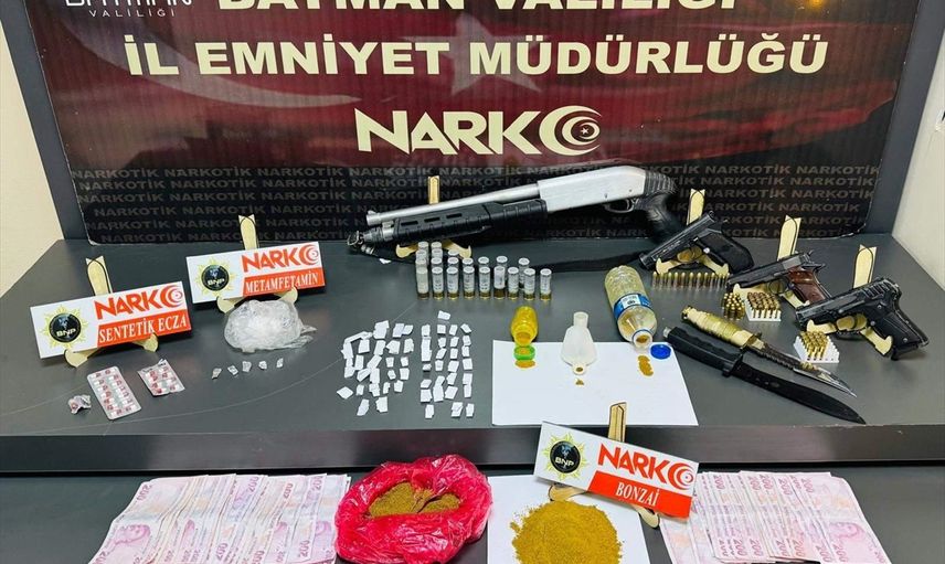 Batman'da düzenlenen uyuşturucu operasyonunda gözaltına alınan 21 zanlıdan 18'i tutuklandı. Ekiplerce 15 farklı adrese düzenlenen operasyonda, 514 gram sentetik kannabinoid, 17 gram metamfetamin, 30 sentetik ecza maddesi, 3 ruhsatsız tabanca, 67 tabanca fişeği, 1 pompalı tüfek, 21 kartuş ve 2 kasatura ele geçirildi, 38 bin liraya el konuldu.
