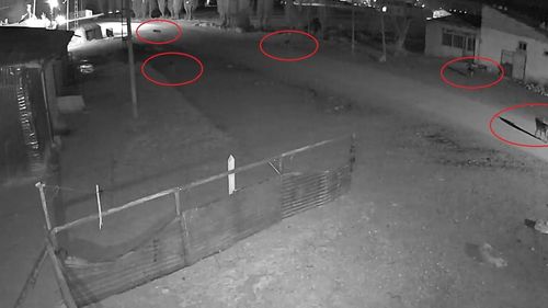 Bayburt'un Oruçbeyli köyünde kaydedilen görüntülerde 5 kurtun bir köpeği sürü taktiğiyle tuzağa çekmeye çalıştığı anlar güvenlik kamerasına yansıdı.