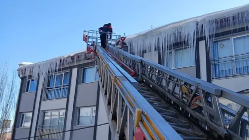 Bayburt'ta bina saçaklarındaki buz sarkıtları itfaiye tarafından temizleniyor