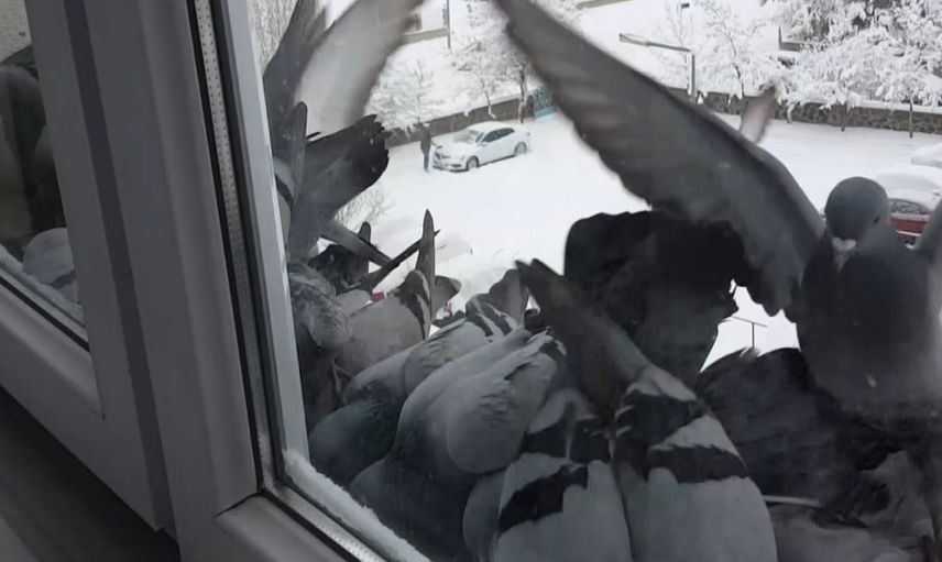 Pencere önünde toplanan güvercinler, yemlere ulaşabilmek için birbirleriyle rekabet etti; bu görüntüler, bölgedeki soğuk havanın yaban hayatı üzerindeki doğrudan etkisini ortaya koydu.