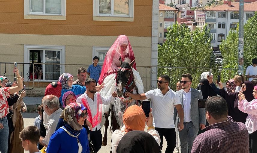 Bayburt'ta kayınpederinin isteğini geri çevirmeyen gelin, damadın evine at üzerinde getirildi.
