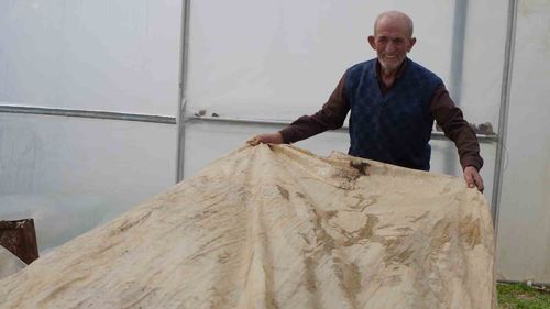 76 yaşındaki İsmail Öksüz, ata tohumlarını korumak için serasında ikinci örtü, dumanlama ve ısıtıcıyla zirai dona karşı önlem alıyor.