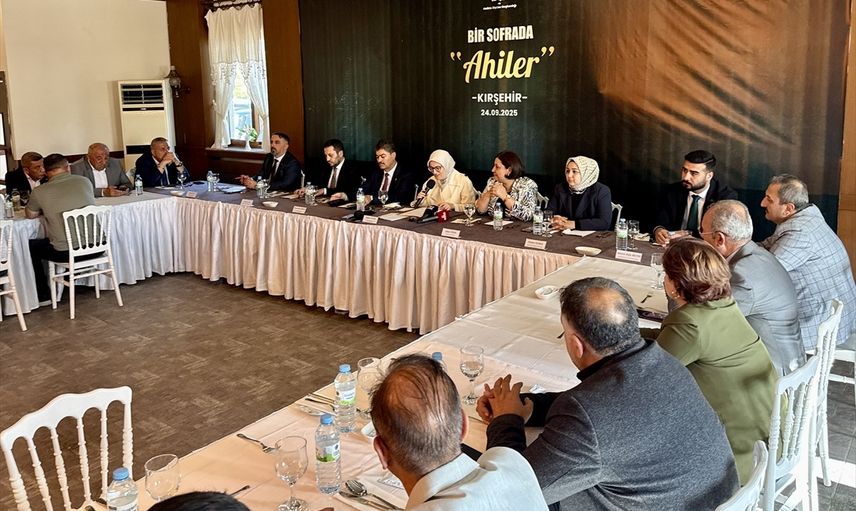 AK Parti Genel Başkan Yardımcısı Belgin Uygur (ortada), "Bir Sofrada Ahiler" programına katılmak üzere Kırşehir'e geldi. Uygur, AK Parti Kırşehir Milletvekili Necmettin Erkan (sol 4) ve AK Parti Kırşehir İl Başkanı Seher Ünsal (sağ 6) ve partililer ile bir araya geldi.