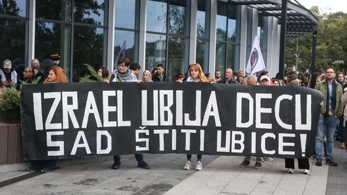 Belgrad'ta yüzlerce kişi, Filistin Halkına Destek Platformu öncülüğünde İsrail'in Gazze'de 8 Ekim 2023'ten bu yana süren iki yıllık operasyonunu protesto etti.