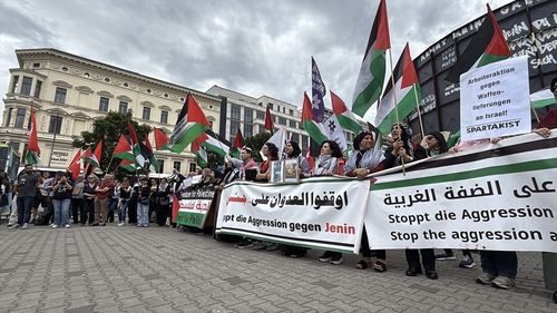 Almanya’nın başkenti Berlin’de, Filistin’e destek amacıyla iki ayrı gösteri gerçekleştirildi. Mitte semtindeki Friedrich ve Zimmer caddelerinin kesiştiği meydanda, 150’nin üzerinde kişi toplandı.Göstericiler, Filistin bayrakları ve üzerinde "Filistinli çocuklar büyümeyi hak ediyor", "Filistin’e özgürlük", "Saldırganlığı durdurun" ve "Gazze’deki kuşatmayı kaldırın" yazılı…